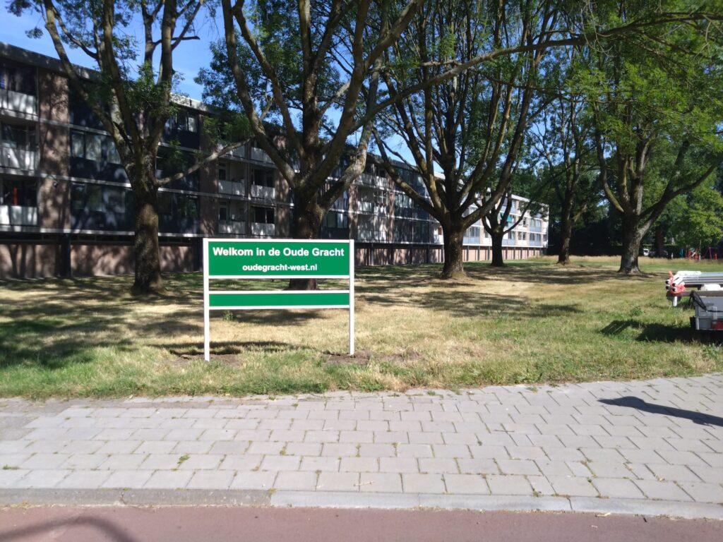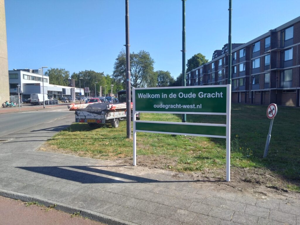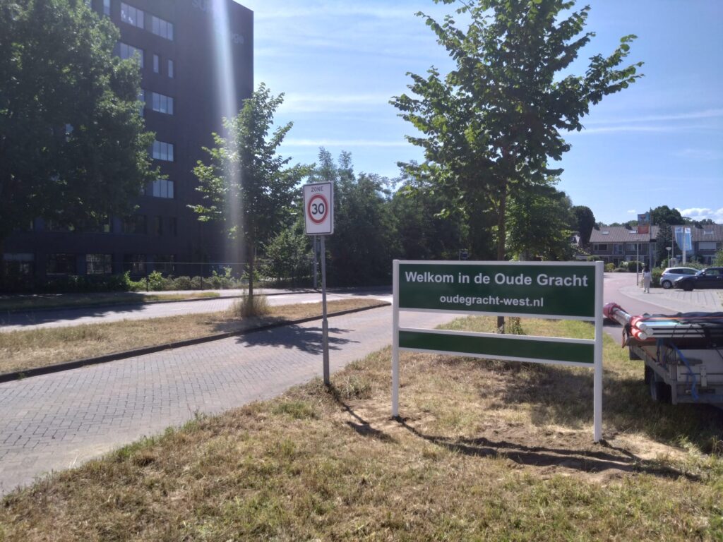 Bij drie wegen waarlangs je onze buurt inrijdt, zijn wijkborden geplaatst: bij de rotonde aan het begin van de Muzenlaan, bij de rotonde aan het begin van de Amazonenlaan en aan de Mercuriuslaan (tegenover het Summacollege). Deze borden heten je welkom in de Oude Gracht.